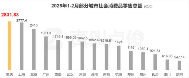 今年 1~2 月重庆社会消费品零售总额 2831 亿元,超越了上海的 2777 亿元。